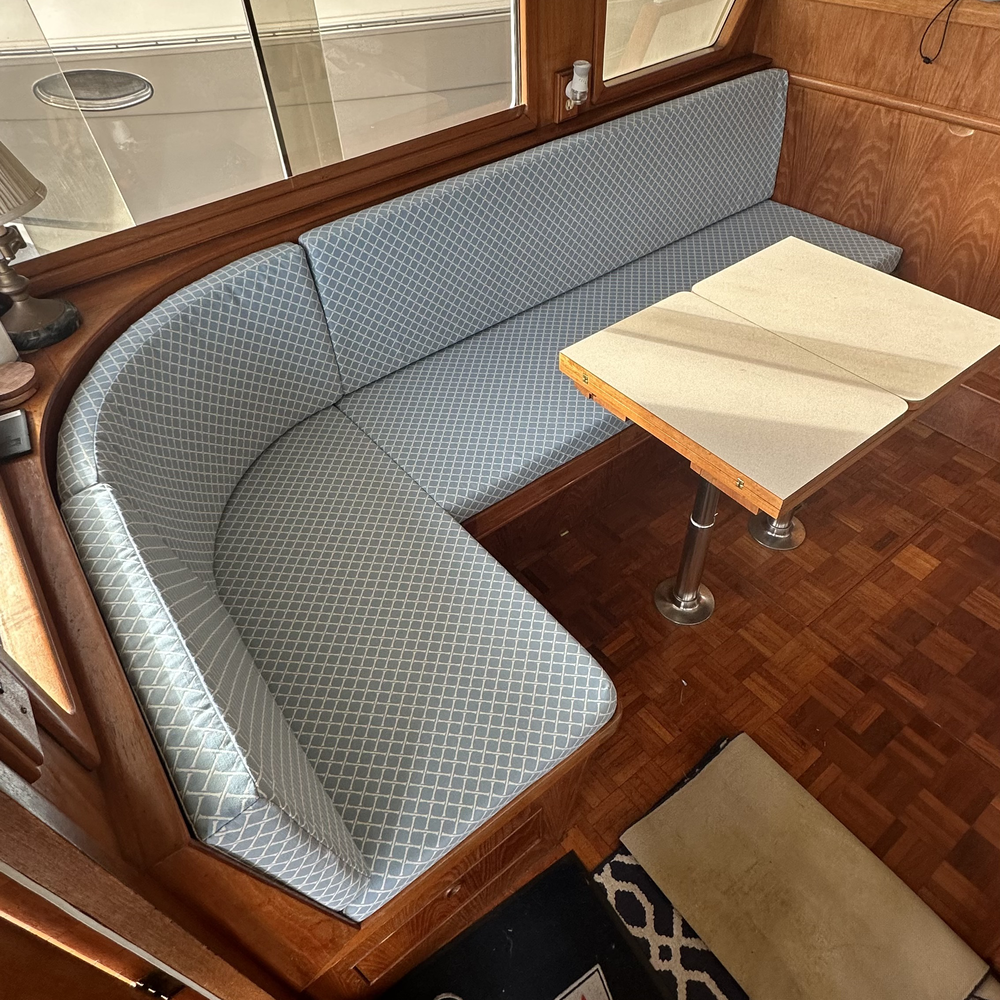 This 1986 Trawler underwent a complete interior transformation designed to combine modern comfort with classic nautical style. The project included custom-built salon couches and stylish curtains, a revamped V-bench, and a brand-new bedroom mattress for restful nights at sea. For extra protection and longevity, we created bespoke wooden railing covers for the winter season.